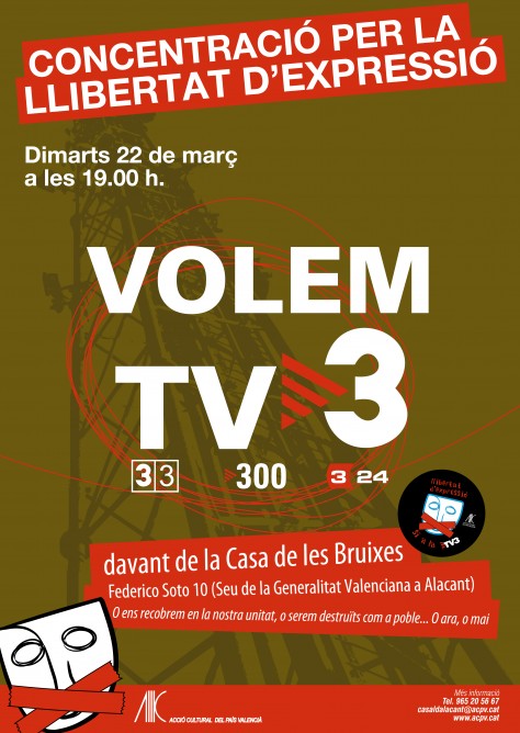 19:00h. Alacant (Alacantí). Concentració per TV3 davant de la Casa de Bruixes (seu de la Generalitat Valenciana a Alacant). Convoca la Delegació d'ACPV a Alacant.